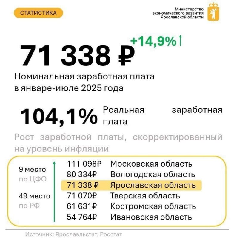 По данным Ярославльстата, среднемесячная зарплата в регионе в январе–июле 2025 года составила 71 338 рублей. Это +14,9% к прошлому году;По этому показателю Ярославская область заняла 9 место среди регионов Центрального федерального округа;И 49 место...