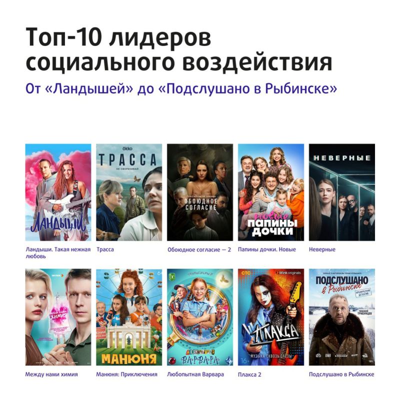 В тройку лидеров вошли сериалы «Ландыши. Такая нежная любовь», «Трасса» и «Обоюдное согласие — 2». Всего в рейтинг попали 33 фильма и сериала, которые сочетают широкий охват аудитории с затрагиванием значимых социальных тем.Среди топ-10 также отмечены...