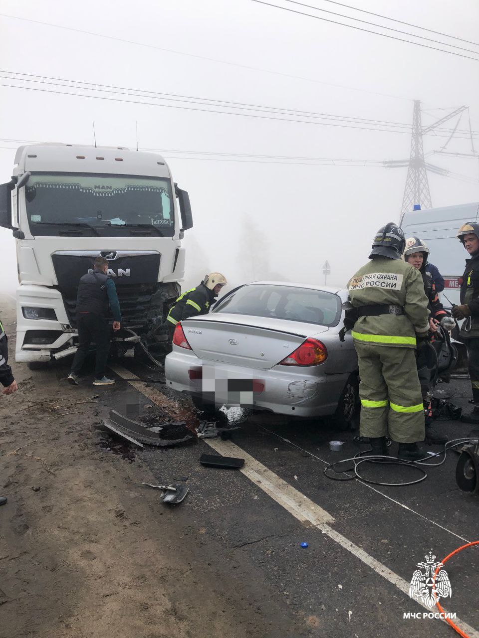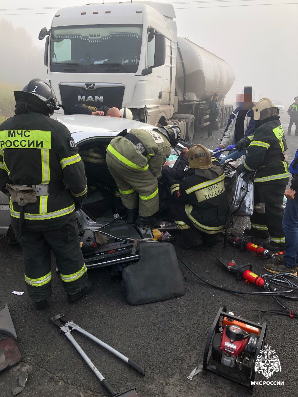 На месте вызова произошло столкновение двух транспортных средств без последующего горения. Огнеборцы МЧС России спасли водителя и 3 пассажиров легкового автомобиля, одного человека деблокировали. Все пострадавшие госпитализированы в медицинское учреждение. Водитель тягача с прицепом не пострадал.