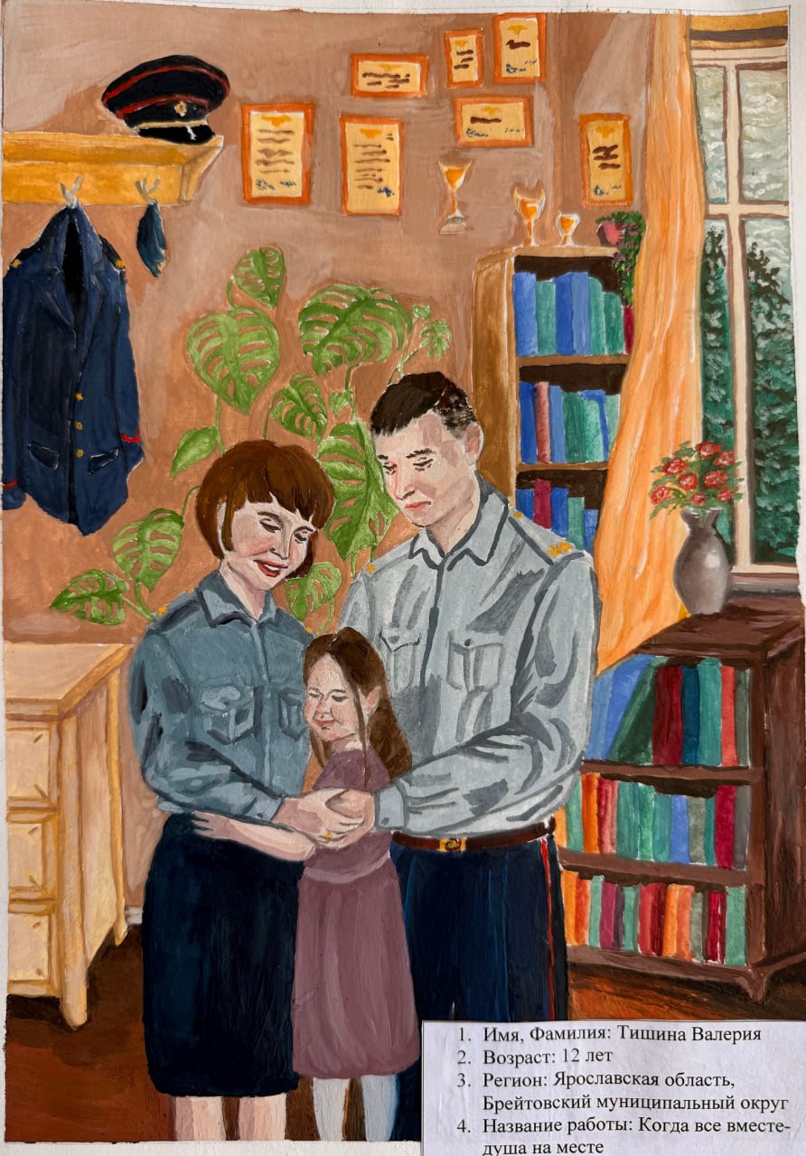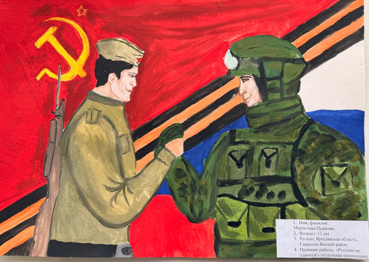 В творческих конкурсах регионального УМВД Мирослава участвует каждый год, ее рисунки всегда яркие и запоминающиеся. На этот раз ее работа стала лучшей в рамках специальной номинации, посвященной Году защитника Отечества. В своей творческой работе Мира изобразила советского солдата, который передает современному бойцу опыт поколений и веру в то, что победа будет за нами.