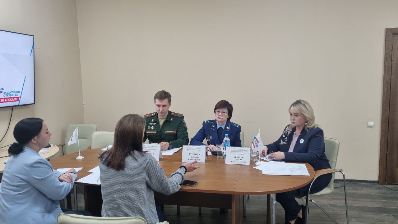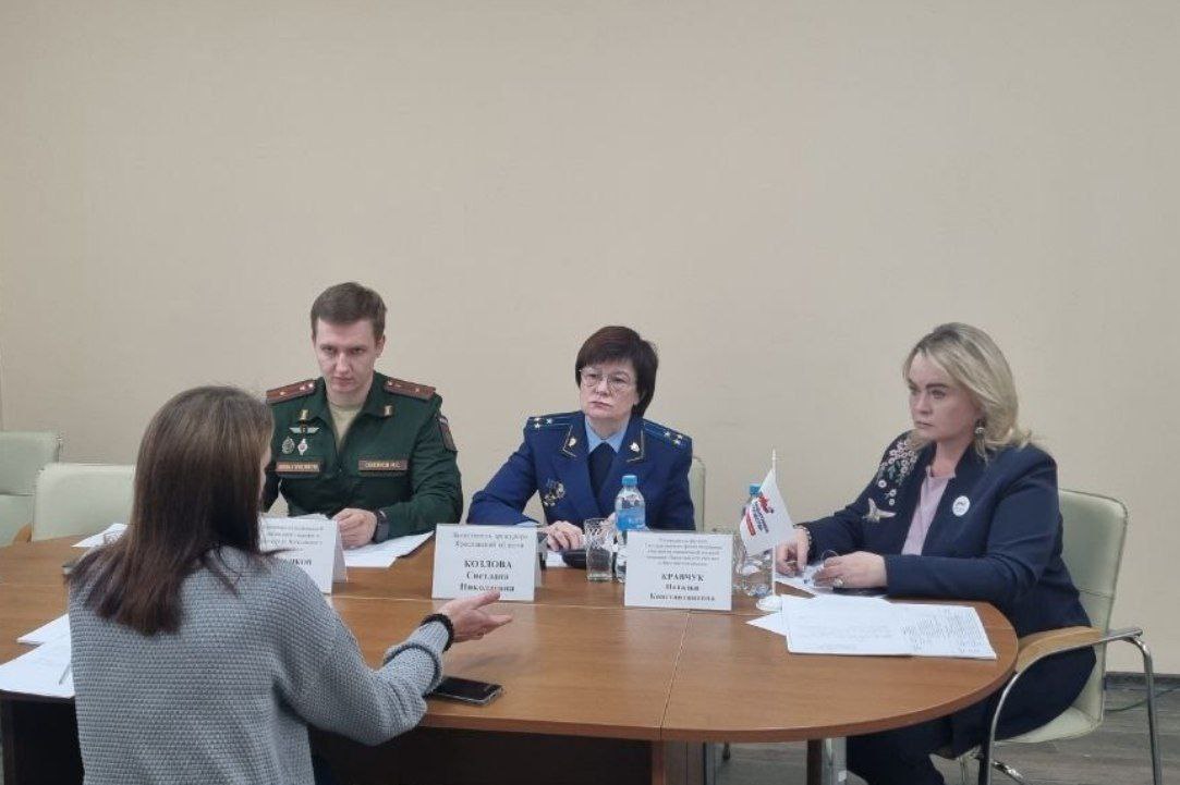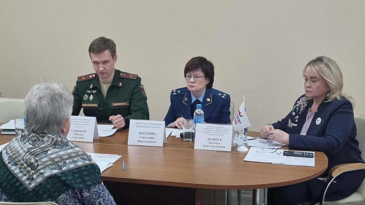 Заместитель прокурора Ярославской области Светлана Козлова совместно с ВРИО военного прокурора Ярославского гарнизона Максимом Савенковым и руководителем филиала Государственного фонда поддержки участников специальной военной операции «Защитники Отечества» в Ярославской области Натальей Кравчук провела личный приём участников специальной военной операции и членов их семей.