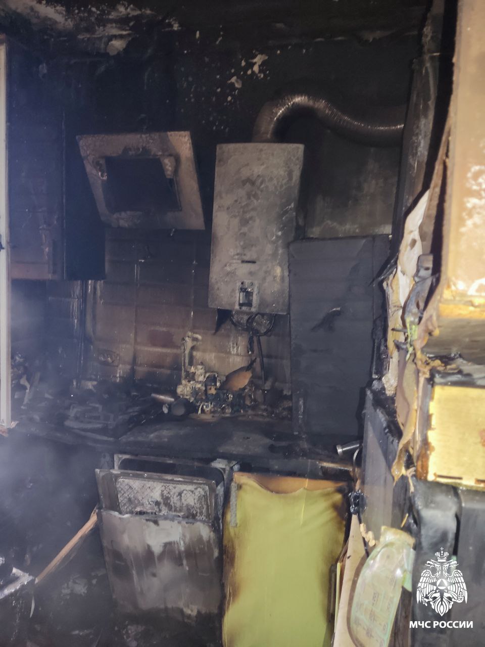 Огнем в кухне уничтожены мебель и электроприборы на площади 2 квадратных метров, закопчены стены и потолок квартиры на 42 квадратах.