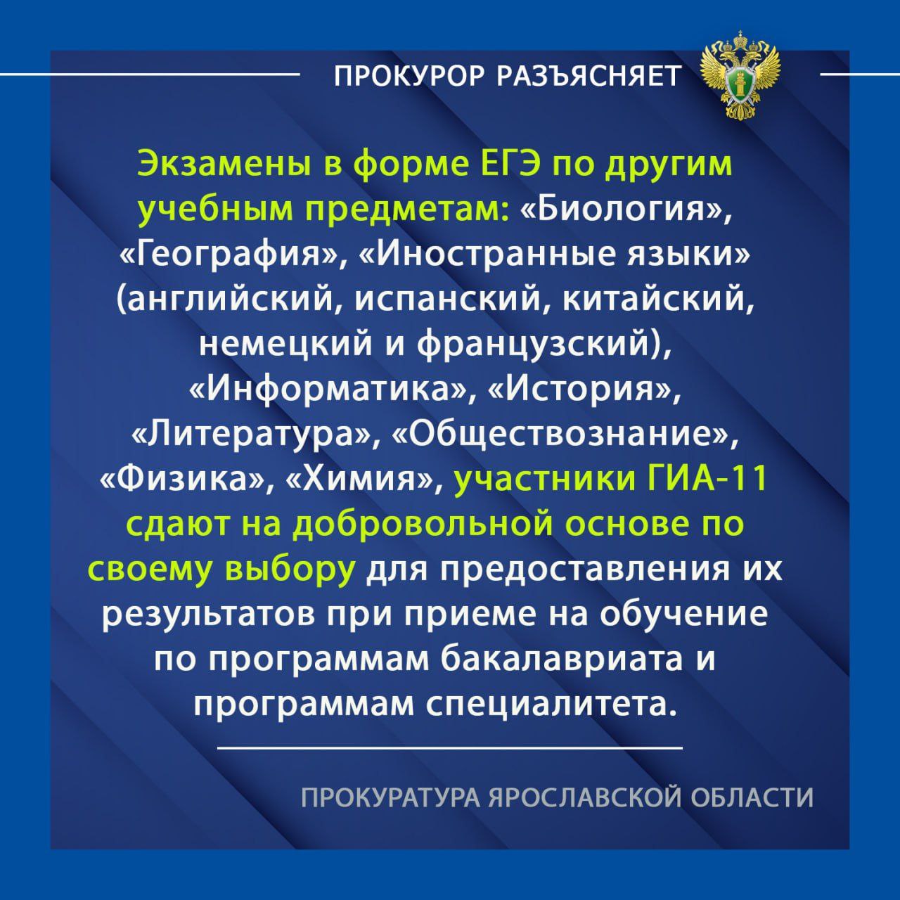 Экзамены в форме ЕГЭ по другим учебным предметам: Биология, География, Иностранные языки (английский, испанский, китайский, немецкий и французский), Информатика, История, Литература, Обществознание, Физика, Химия (далее вместе - учебные предметы по выбору) участники ГИА-11 сдают на добровольной основе по своему выбору для предоставления их результатов при приеме на обучение по программам бакалавриата и программам специалитета.