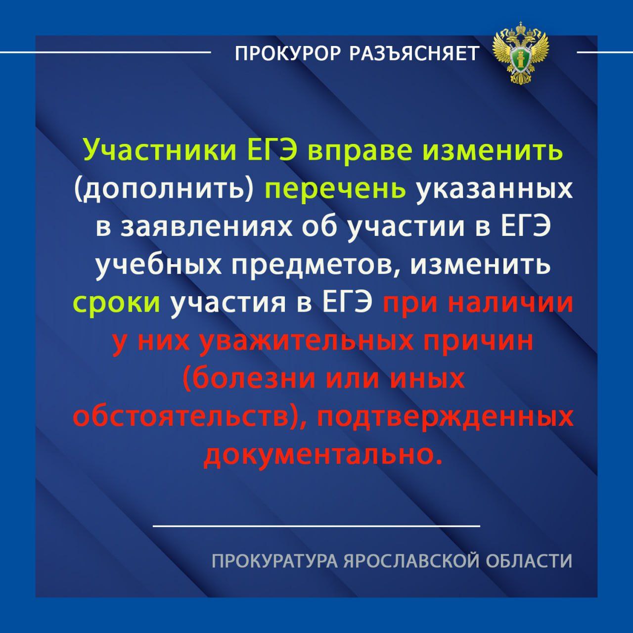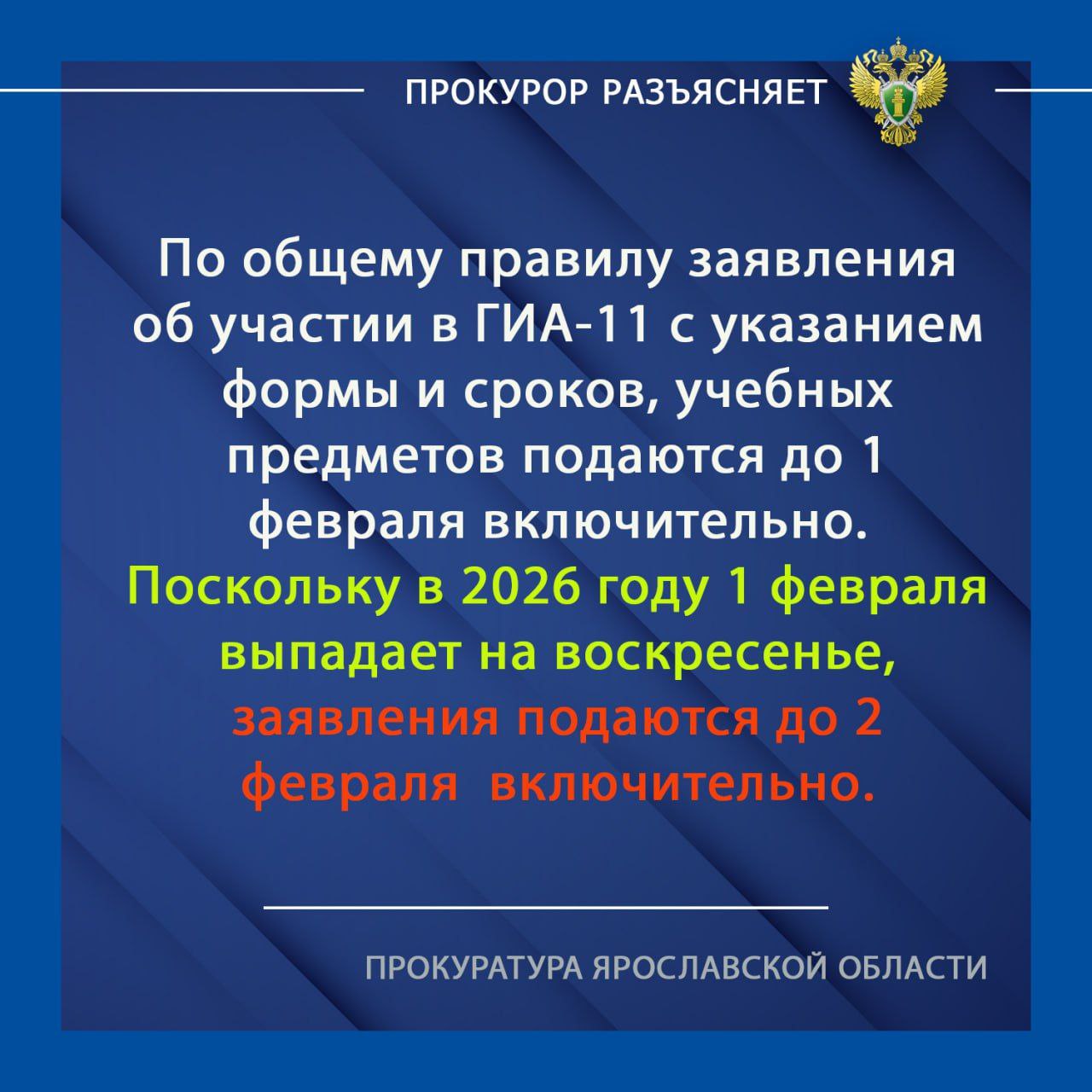 Участники ЕГЭ вправе изменить (дополнить) перечень указанных в заявлениях об участии в ЕГЭ учебных предметов, изменить сроки участия в ЕГЭ при наличии у них уважительных причин (болезни или иных обстоятельств), подтвержденных документально.По общему правилу заявления об участии в ГИА-11 с указанием формы и сроков, учебных предметов подаются до 1 февраля включительно. Поскольку в 2026 году 1 февраля выпадает на воскресенье, заявления подаются до 2 февраля включительно.