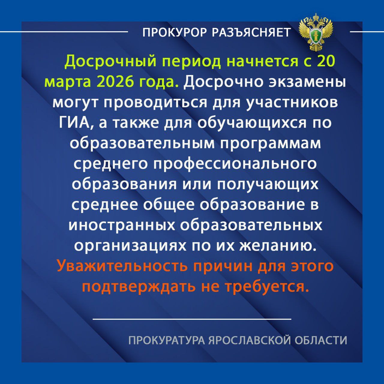 Досрочно экзамены могут проводиться для участников ГИА, а также для обучающихся по образовательным программам среднего профессионального образования или получающих среднее общее образование в иностранных образовательных организациях по их желанию. Уважительность причин для этого подтверждать не требуется.