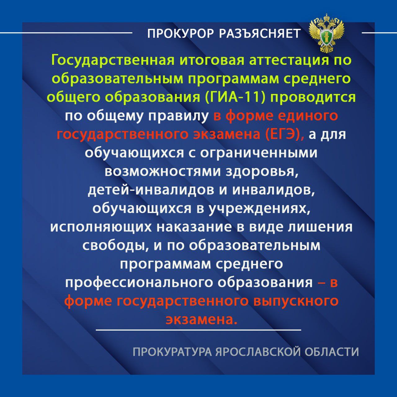 Государственная итоговая аттестация по образовательным программам среднего общего образования (ГИА-11) проводится по общему правилу в форме единого государственного экзамена (ЕГЭ), а для обучающихся с ограниченными возможностями здоровья, детей-инвалидов и инвалидов, обучающихся в учреждениях, исполняющих наказание в виде лишения свободы, и по образовательным программам среднего профессионального образования в форме государственного выпускного экзамена.