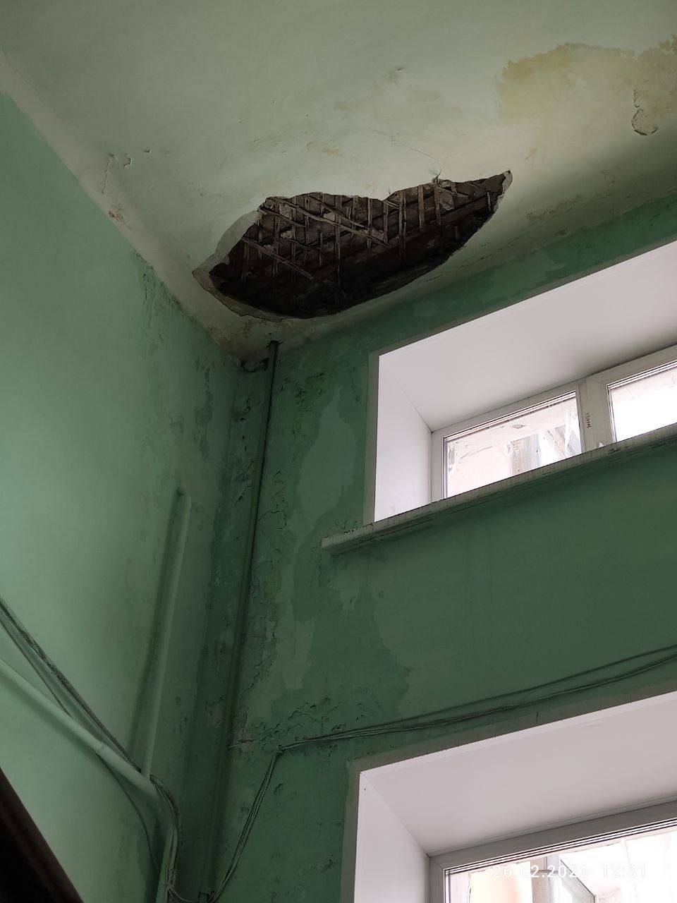 При выезде на место с представителями управляющей компании проведён осмотр состояния кровли и штукатурного слоя в подъезде.Причиной обрушения штукатурного слоя стали протечки кровли в связи с ненадлежащим ее содержанием.