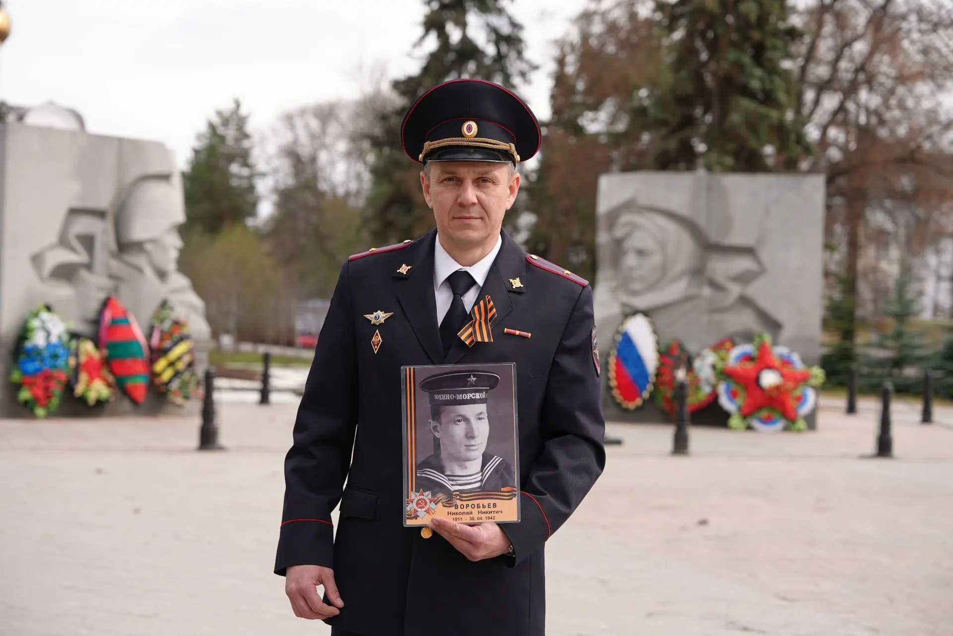 Заместитель командира ОБ ППСП УМВД России по Ярославской области Артем Давыдов с портретом прадеда Воробьева Николая Никитича.