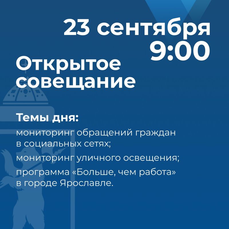 23 сентября в 9:00 состоится публичная планерка под руководством мэра Артёма Молчанова.На совещании поднимут актуальные вопросы городской жизни. Подробнее — в карточкеТрансляция будет доступна на официальном портале мэрии города Ярославля....
