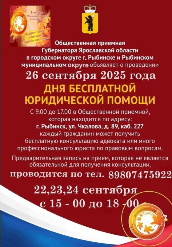 26 сентября с 09:00 до 17:00 каждый житель Рыбинска и Рыбинского района сможет получить бесплатную консультацию адвоката или иного профессионального юриста по правовым вопросам.Предварительная запись, которая не является обязательной, проводится 22...