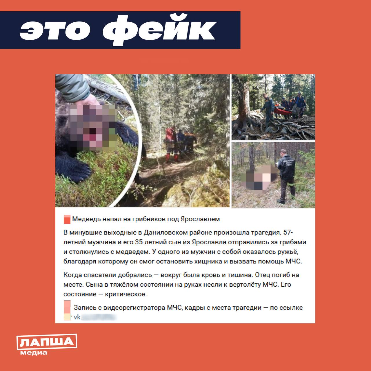 В чатах и каналах Ярославской области появились сообщения о медведе, напавшем на грибников. Якобы из-за столкновения с косолапым пострадали отец и сын.