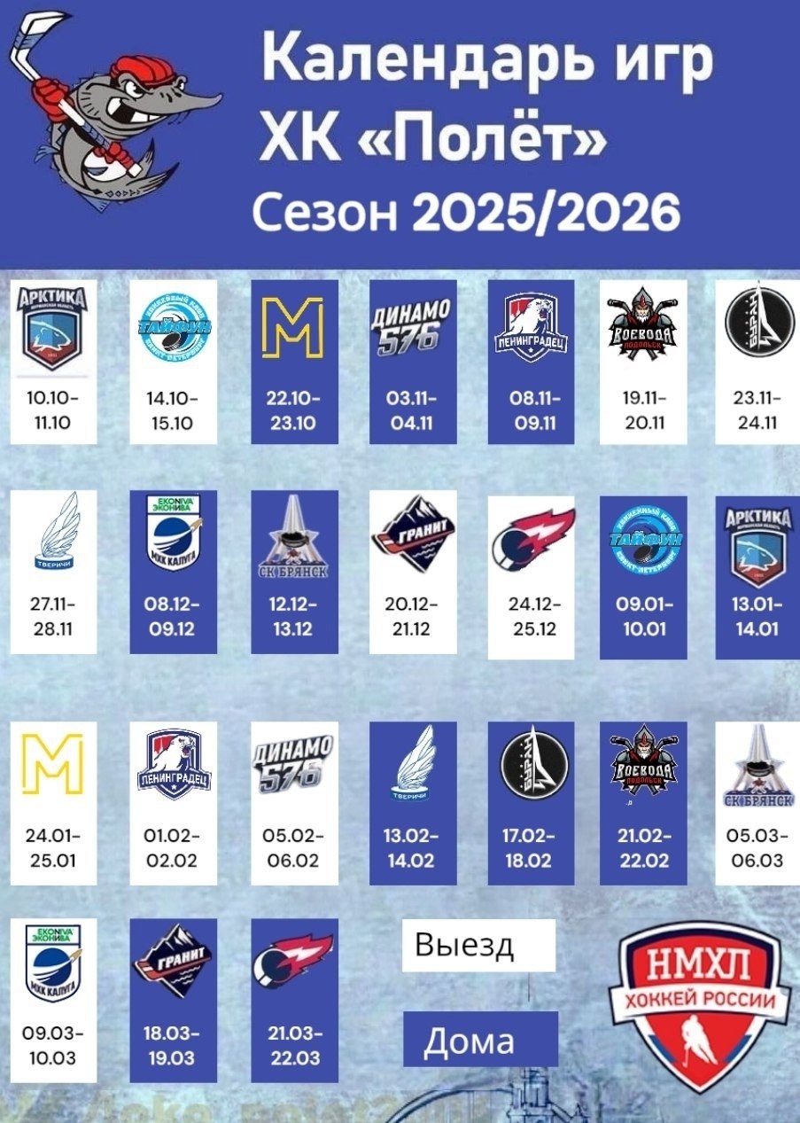 Календарь игр рыбинского «Полета» в регулярном чемпионате НМХЛ 2025/2026