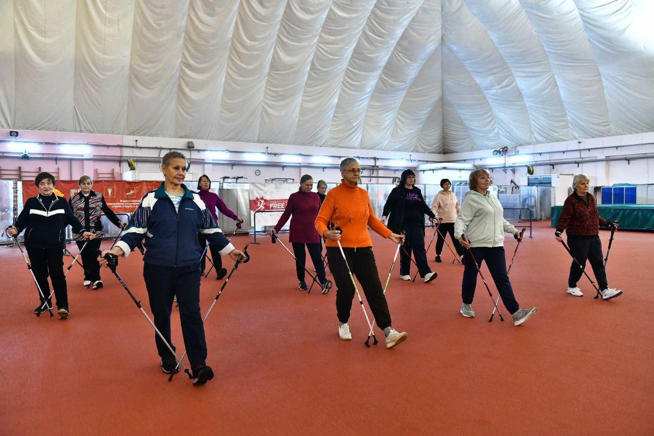 В легкоатлетическом манеже «Ярославль» проходят тренировка по скандинавской ходьбе. В группе занимаются от 10 до 25 человек. Проект «Активное долголетие» направлен на улучшение качества жизни пожилых людей.