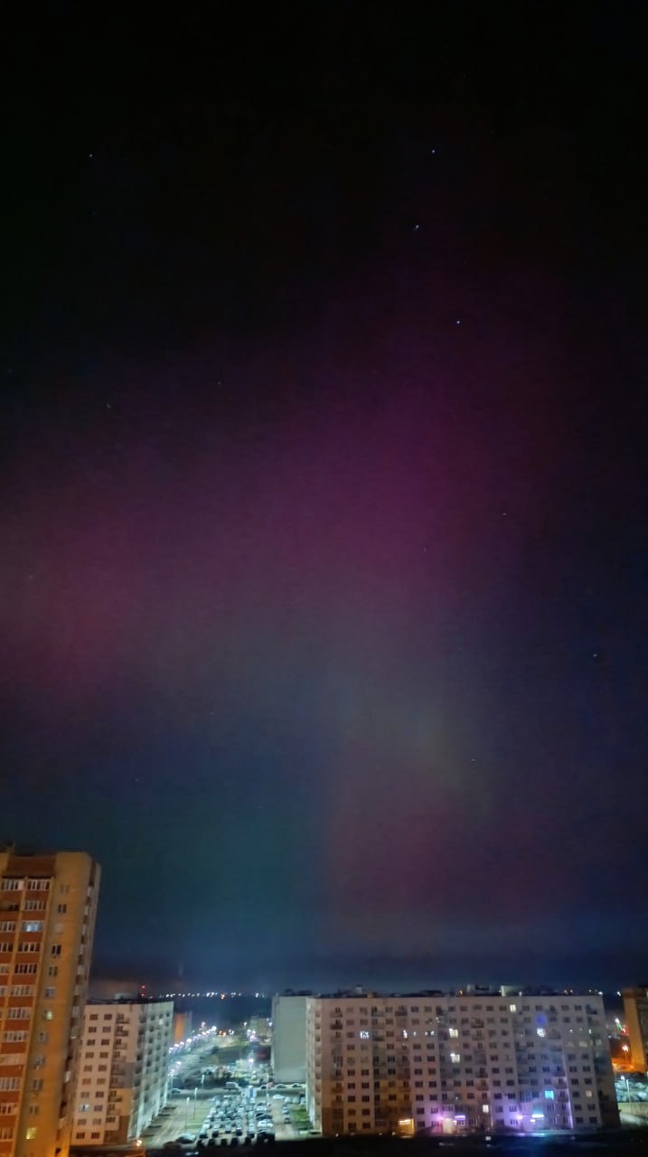 Небо над многими регионами вспыхнуло невероятными оттенками зелёного, фиолетового и розового.