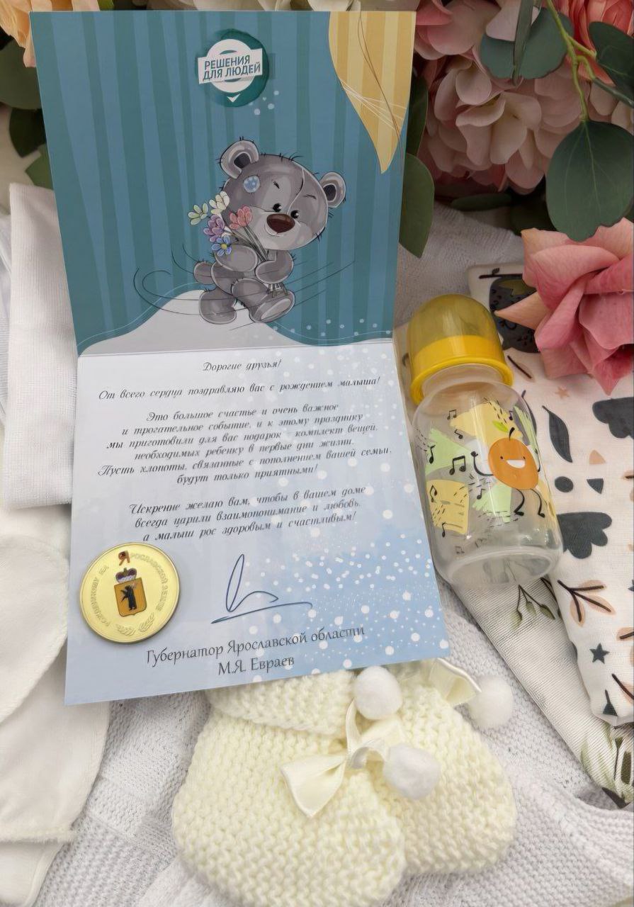 Теперь родители вместе со свидетельством о рождении и комплектом необходимых вещей по проекту «Привет, малыш!» получают и памятную медаль. Она изготовлена из латуни, на лицевой стороне – герб Ярославской области.