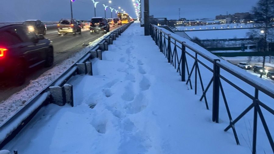 Пешеходные зоны на Октябрьском мосту замело снегом