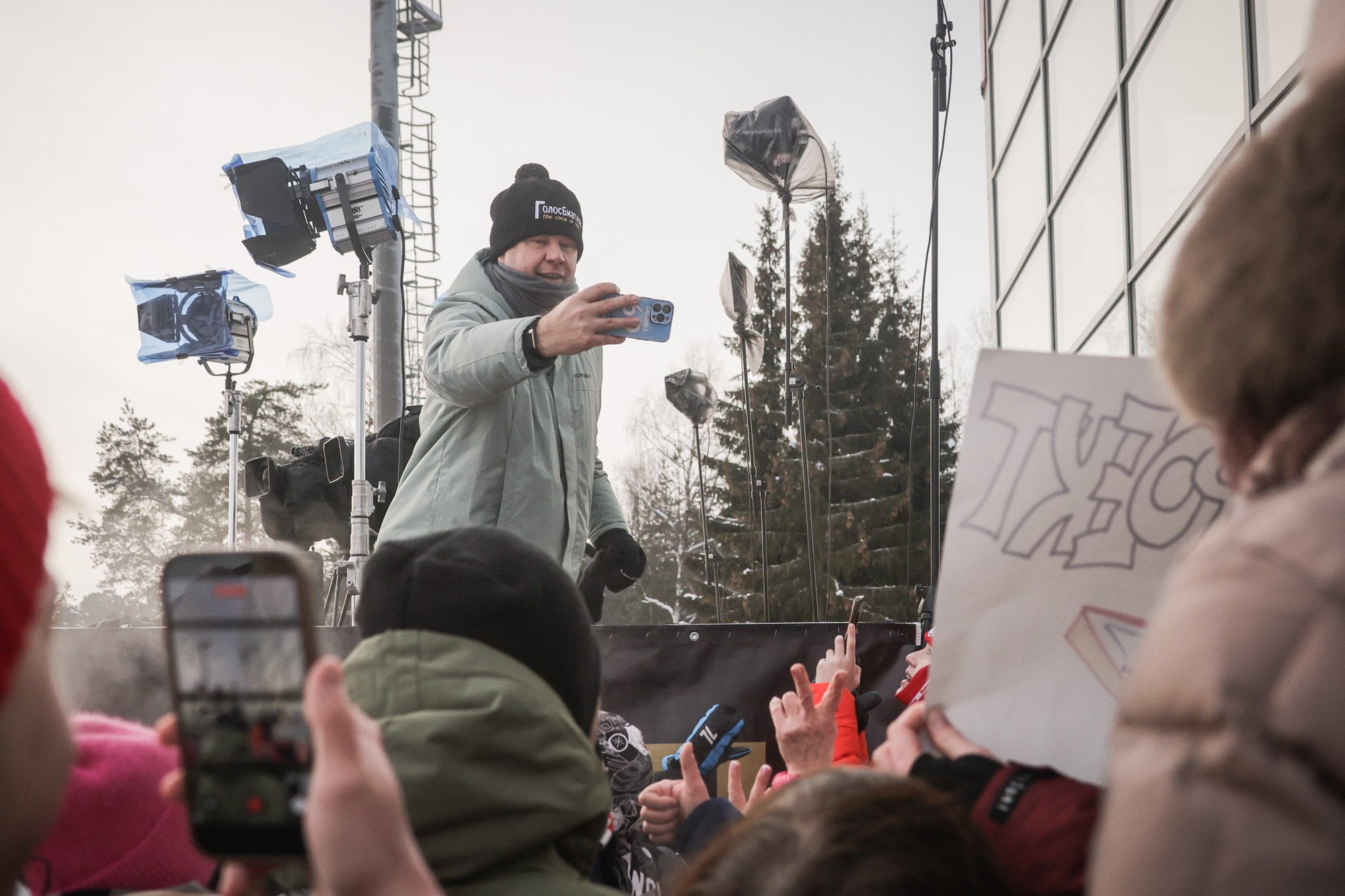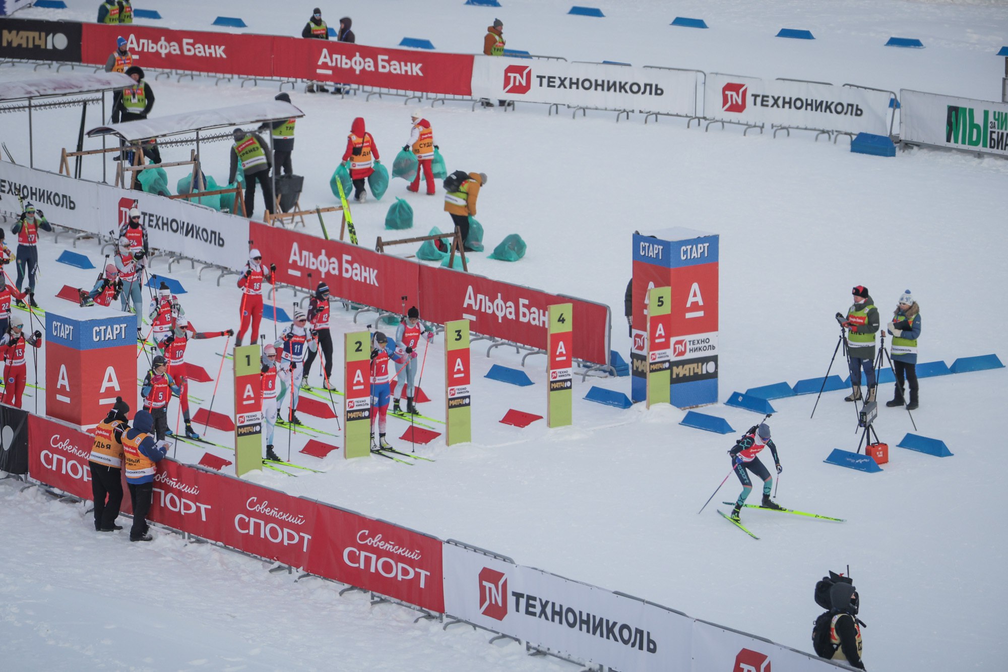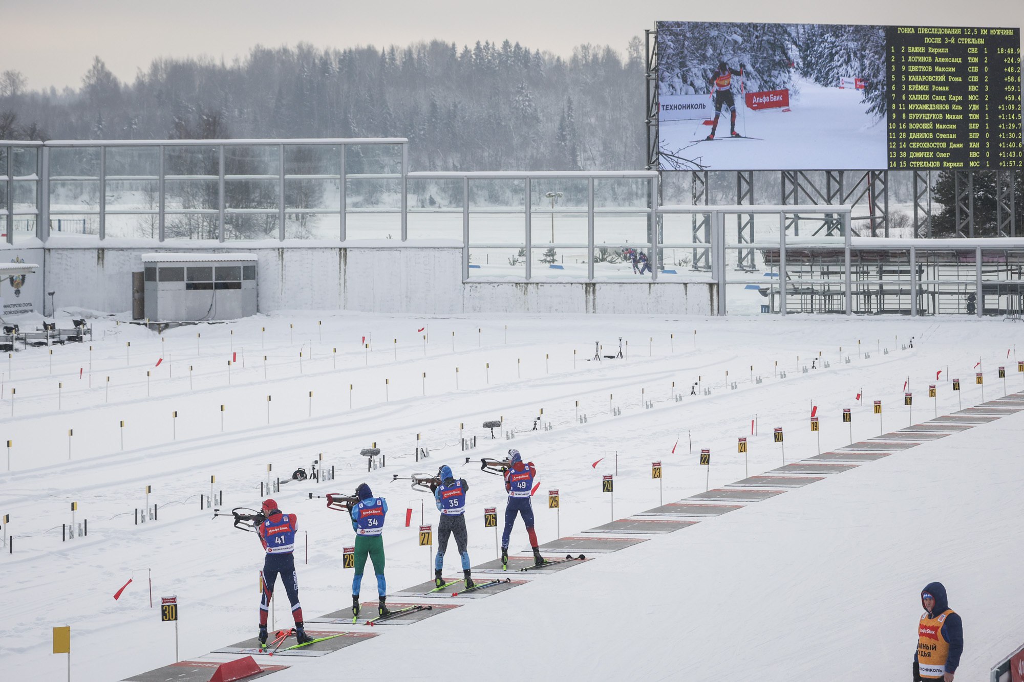 На 25-метровом экране, который является самым большим в России на биатлонных стадионах, зрители на трибунах могли видеть трансляцию телеканала «Матч-ТВ» с биатлонной трассы Демино.