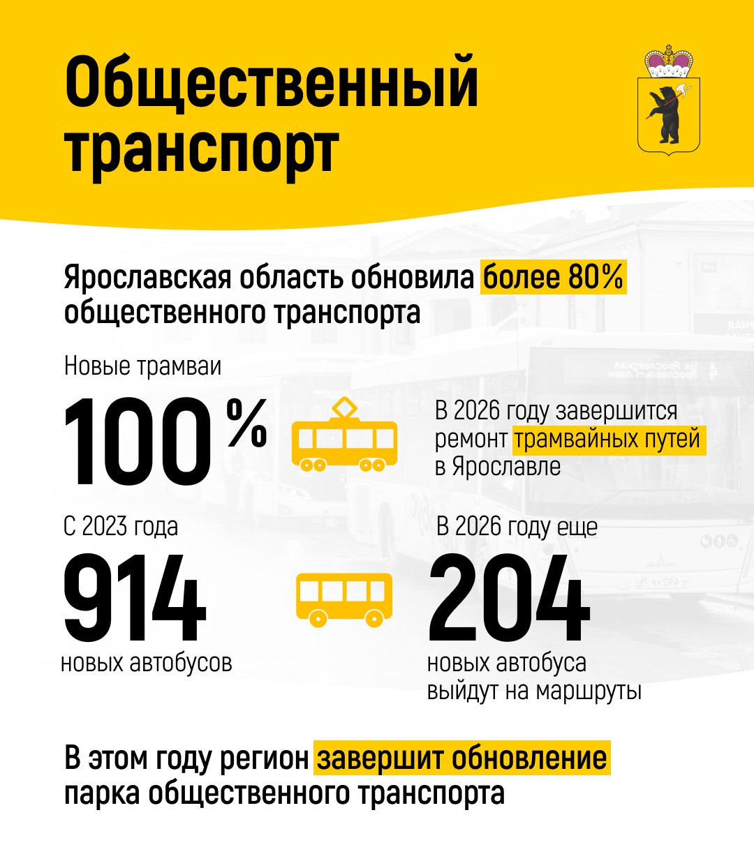 Регион полностью обновил парк трамваев, приобрел новые электробусы и завершает обновление автобусов. На маршрутах работают новые, современные машины. Более 80% общественного транспорта уже обновили. По планам, работу завершат на 100% уже в этом году.