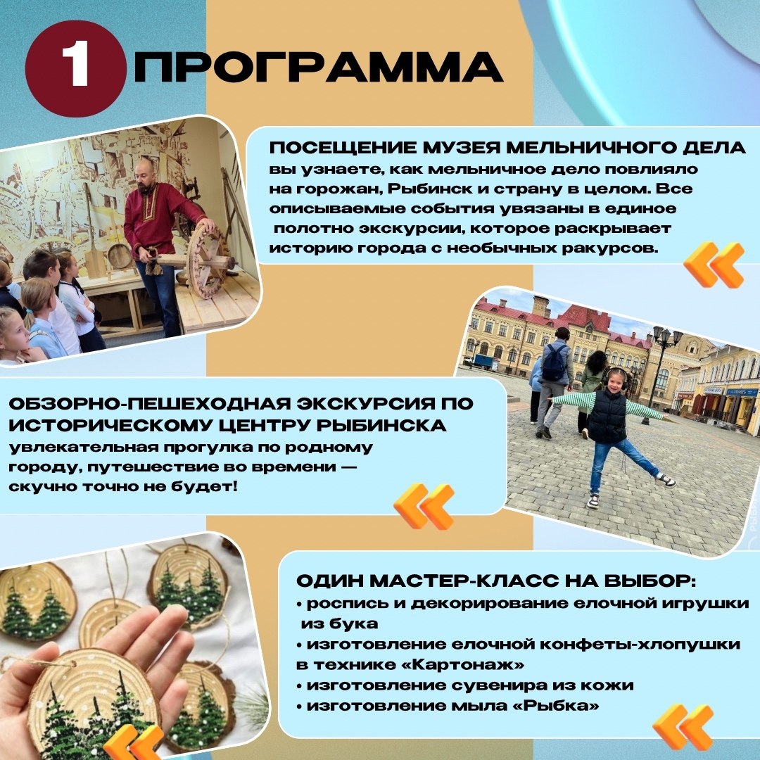 Учащихся начальной и средней школы приглашают на увлекательные прогулки по историческому центру города с экскурсоводом, посещение «Музея новогодней игрушки» или «Музея мельничного дела» и творческий мастер-класс.