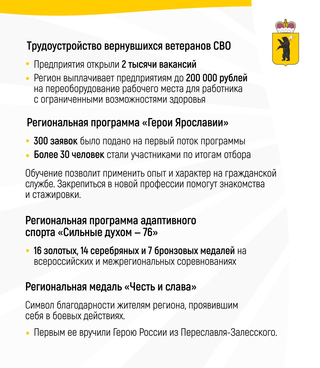 О региональных мерах губернатор Михаил Евраев рассказал на встрече с президентом Владимиром Путиным. В числе реализуемых проектов — программа «Герои Ярославии», спортивная команда «Сильные духом — 76», а также адаптация рабочих мест на производствах и медаль «Честь и слава».