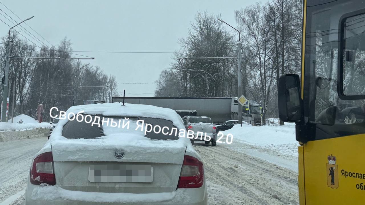 На Тутаевском шоссе тоже собирается пробка. Как сообщают очевидцы, там проезд перегородила фура. По словам очевидцев, водитель пытался развернуться, но маневр не удался, машина застряла.