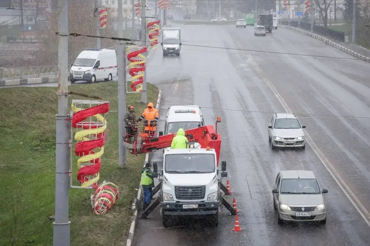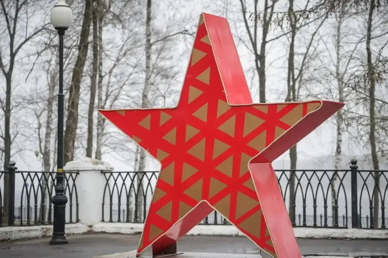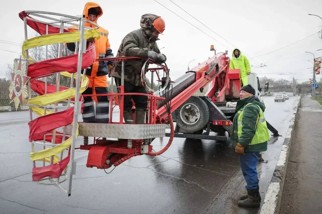 На Герцена монтируем праздничные консоли, у Балюстрады в Волжском парке поставили Звезду. У Полета установим композицию «Каска с гвоздикой». Центральные улицы украсят флаги, звезды и яркие растяжки. Флаги поставим на кругах у Собора, на улицах Правды, Труда, Глебовской, на Советской площади. Празднично оформим площади Дерунова, у Полета и у универмага Юбилейный. Всего за два года практически полностью обновили майский декор. Не просто украшаем улицы, а создаём атмосферу памяти, гордости и общей благодарности.