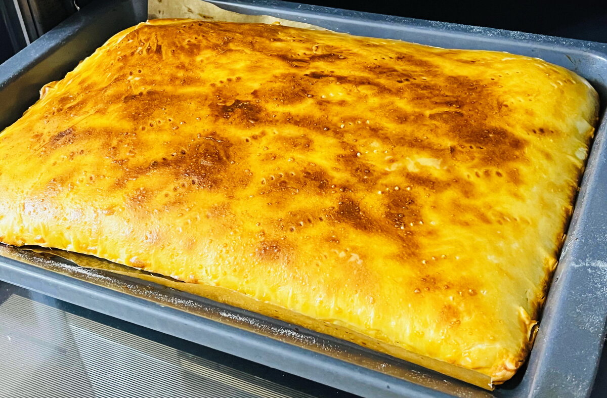 Потерев тесто на четыре части, каждую раскатать в тонкий пласт. Каждый слой смазать мягким сливочным маслом, складывая их пополам. На противень укладываются первые два слоя, сверху равномерно распределяется начинка, затем закрываются оставшимися слоями теста.