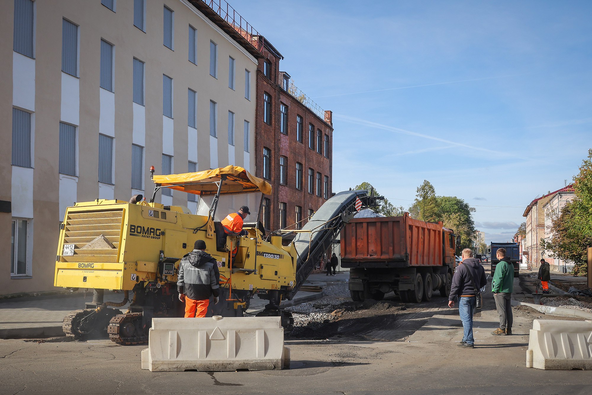 Подрядная организация снимает остатки старого асфальта, выполняет грейдирование, далее предстоит подъем горловин колодцев до нормативного состояния, отсыпка основания дороги песком и щебнем. К асфальтировке планируют приступить на следующей неделе.