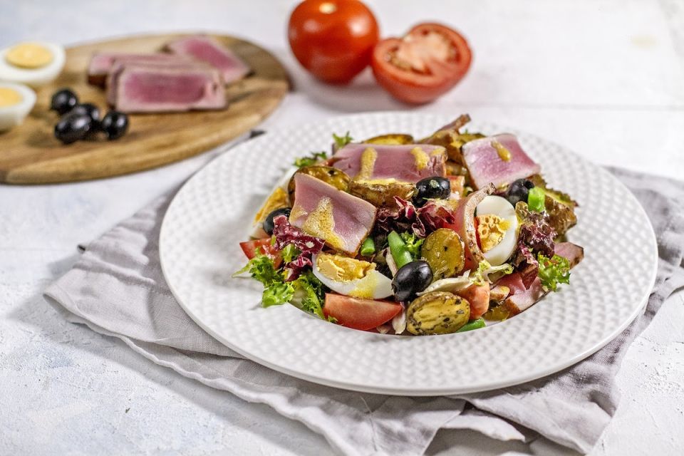 Салат «Нисуаз» — идеальный выбор для любителей свежих и питательных блюд. Этот французский шедевр не только радует глаз, но и наполняет тело энергией благодаря полезным ингредиентам. Специальная горчичная заправка добавляет остроты, а стейк тунца выступает в роли главного героя этого гастрономического спектакля. И, конечно, как же обойтись без яйца, которое завершает картину?