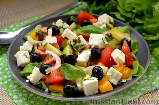 Греческий салат — это обязательный атрибут любого летнего застолья. Свежие помидоры, огурцы, яркий сладкий перец, лук и оливки в сочетании с нежной фетой создают прекрасно сбалансированный вкус. Заправка из оливкового масла и лимонного сока придает ему легкость. Каждый компонент этого салата вдохновляет на новые кулинарные эксперименты!