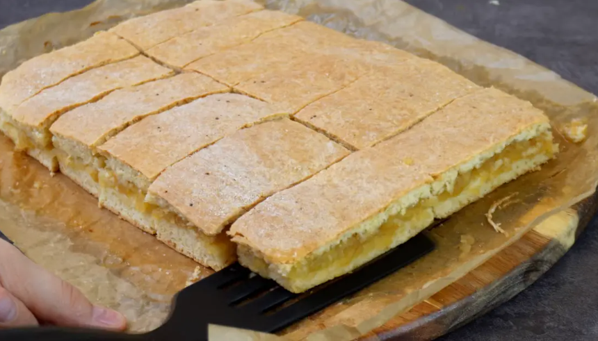 Раскатайте второй пласт теста и накройте начинку. Запекайте в заранее разогретой духовке при температуре 180 градусов около 30 минут. После готовности дайте печенью немного остыть, а затем нарежьте на порционные кусочки.