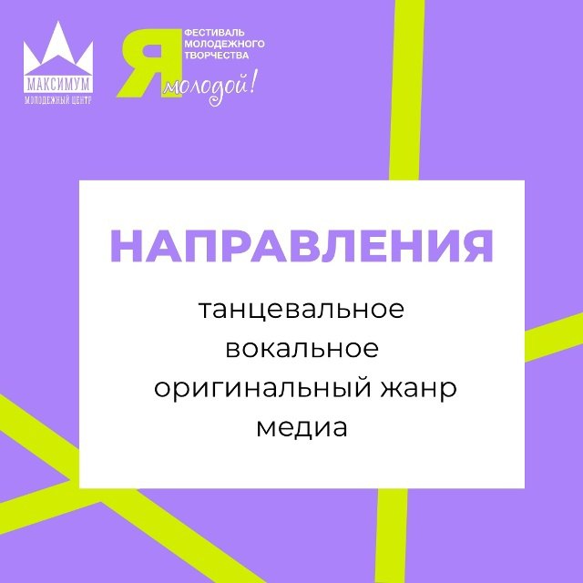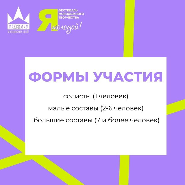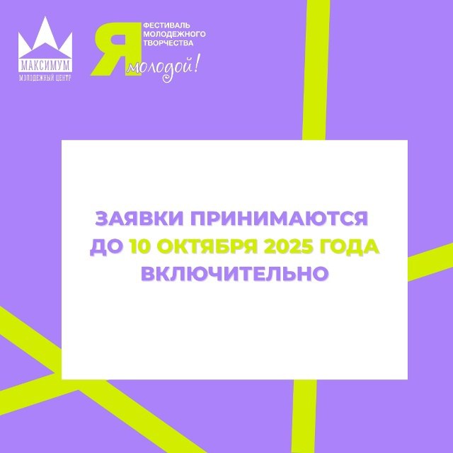 Молодежный центр «Максимум» совместно с управлением молодежной политики принимает заявки от молодежи в возрасте от 14 до 35 на участие в открытом фестивале непрофессионального молодёжного творчества «Я – молодой».