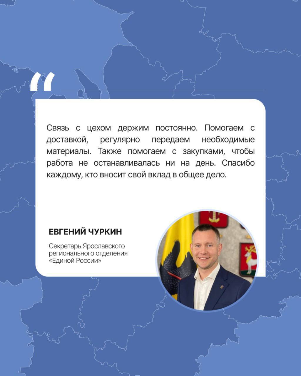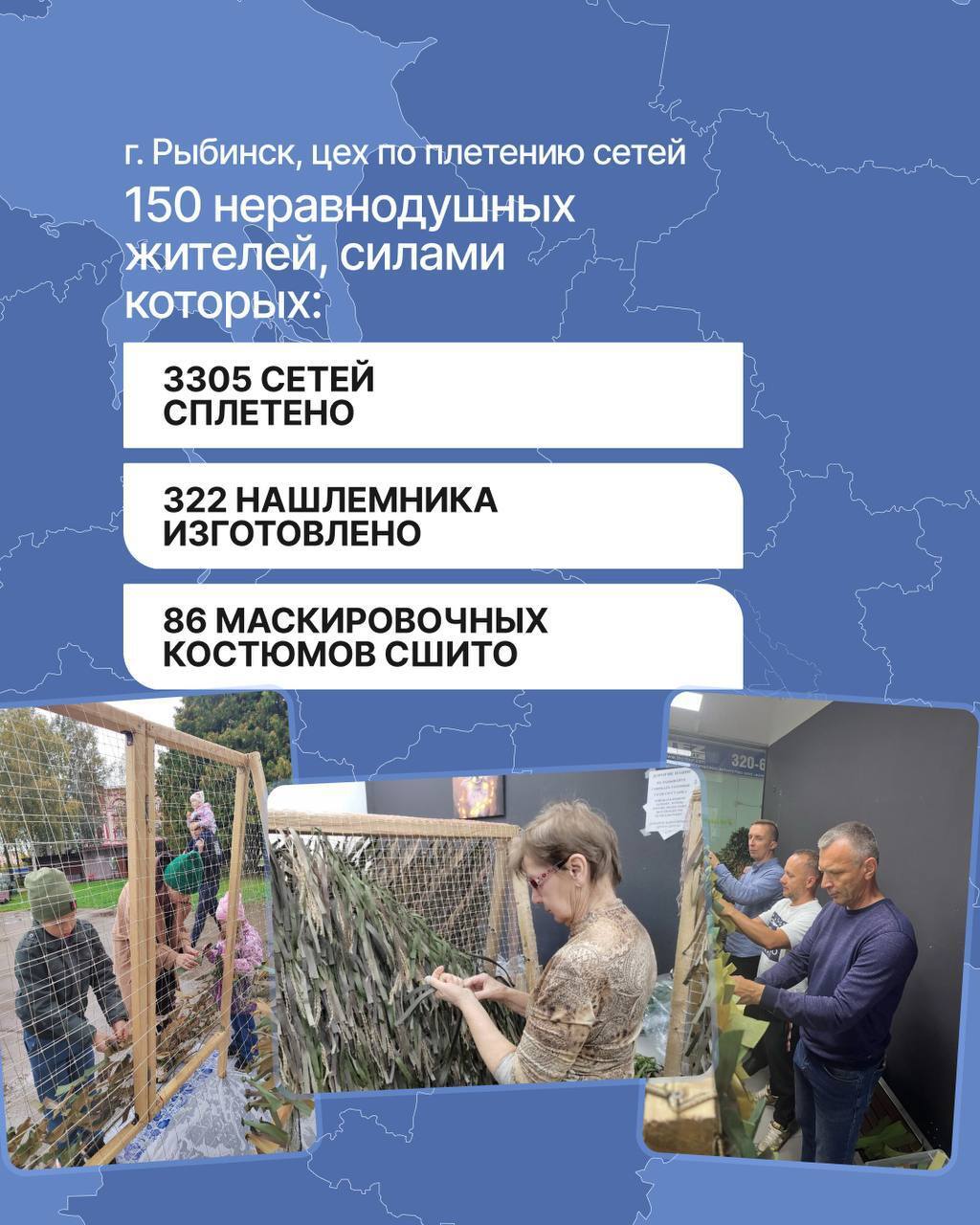 Цех по плетению маскировочных сетей в Рыбинске был создан в апреле 2023 года. Добровольцы готовят для бойцов маскировочные сети, «сухие» души, нашлемники, маскировочные костюмы и другие изделия, которые помогают на фронте.