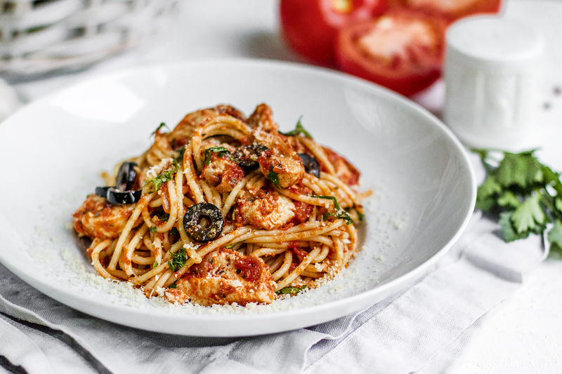 Теперь настало время вводить в блюдо основные томатные компоненты. К обжаренной курице добавить протертые томаты, молотый кориандр и прованские травы, хорошо перемешав. Готовить соус на слабом огне 4-5 минут, по вкусу посолить и поперчить. После этого следует добавить готовые спагетти, тщательно перемешать и прогреть все вместе еще 1-2 минуты. При подаче можно щедро посыпать тертым Пармезаном.