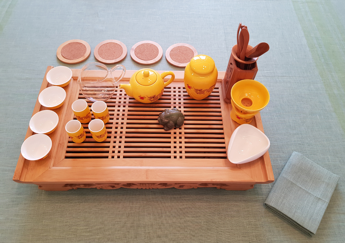 - Следующий шаг — прогревание посуды горячей водой, начиная с ЧаХу (чайника) и затем наливая воду в ЧаХай (чашу справедливости).