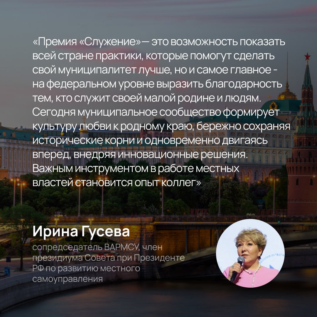 Премия «Служение», учрежденная Президентом России Владимиром Путиным, присваивается за особый вклад в развитие муниципальных образований и повышение качества жизни граждан.
