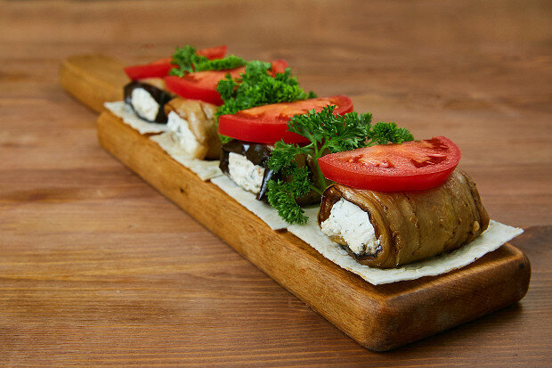 На каждый ломтик баклажана выкладывается столовая ложка начинки, после чего аккуратно сворачивается в рулетик. Для украшения используйте свежую зелень и ломтики помидоров – это добавит цвета и аппетита вашему блюду.