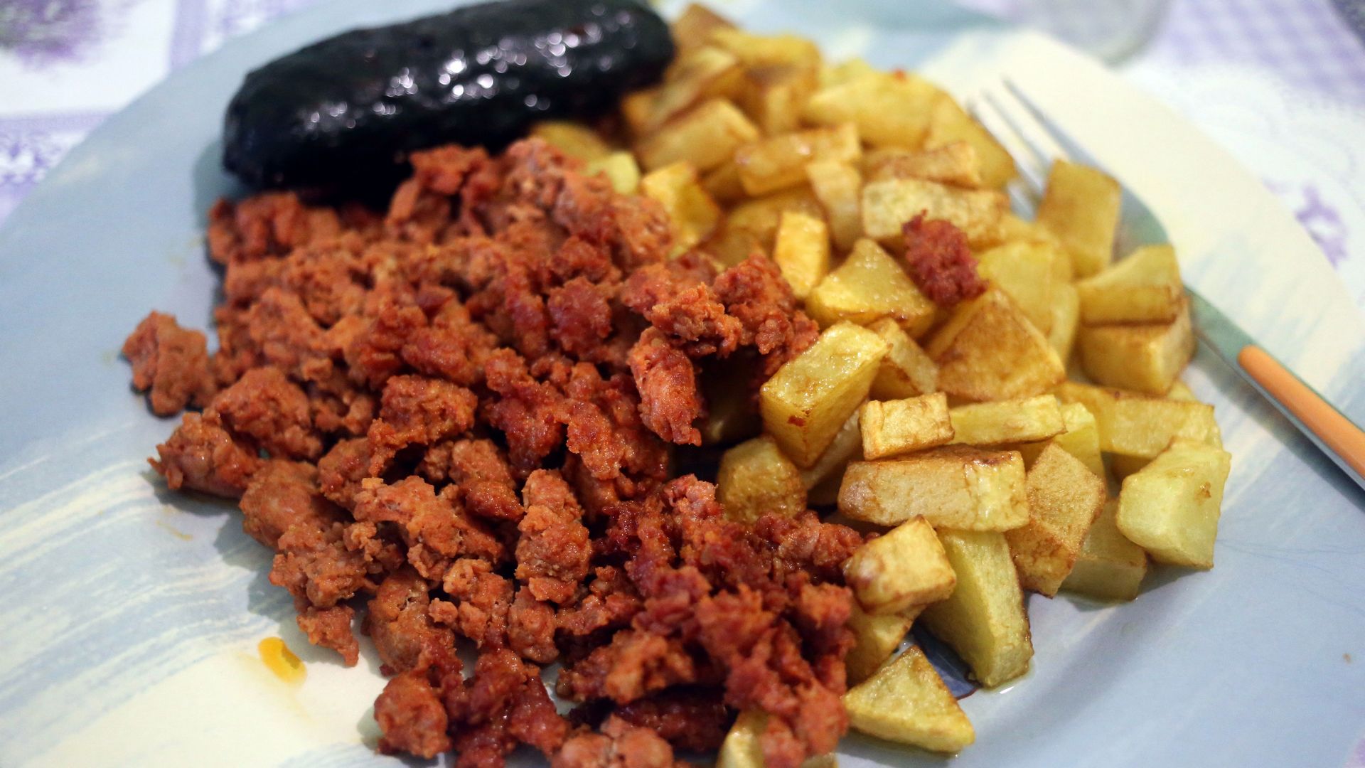 Нарезанный ломтиками картофель необходимо обжарить на раскаленной сковороде на сильном огне. Порезанный перьями лук и говяжий фарш выложить на отдельную сковороду и пожарить до готовности, не забыв о соли и перце. После этого соединяем все в одной емкости.