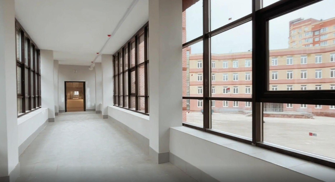На объекте завершены все строительно-монтажные работы. К финишу идёт наладка оборудования. Строительная готовность — 98%. В классах стоит необходимая мебель и оборудование. Подрядчик приводит в порядок территорию и внутренние помещения.