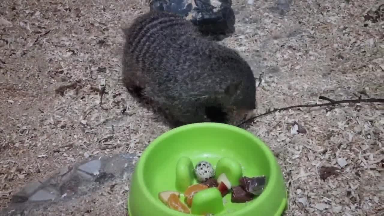Пушистый обитатель тщательно осмотрел всё в миске, нашёл любимое лакомство — перепелиные яйца — и устроил целый утренний ритуал: достал яйцо из миски, покатал, извалял в опилках и только потом разбил его и с удовольствием съел.