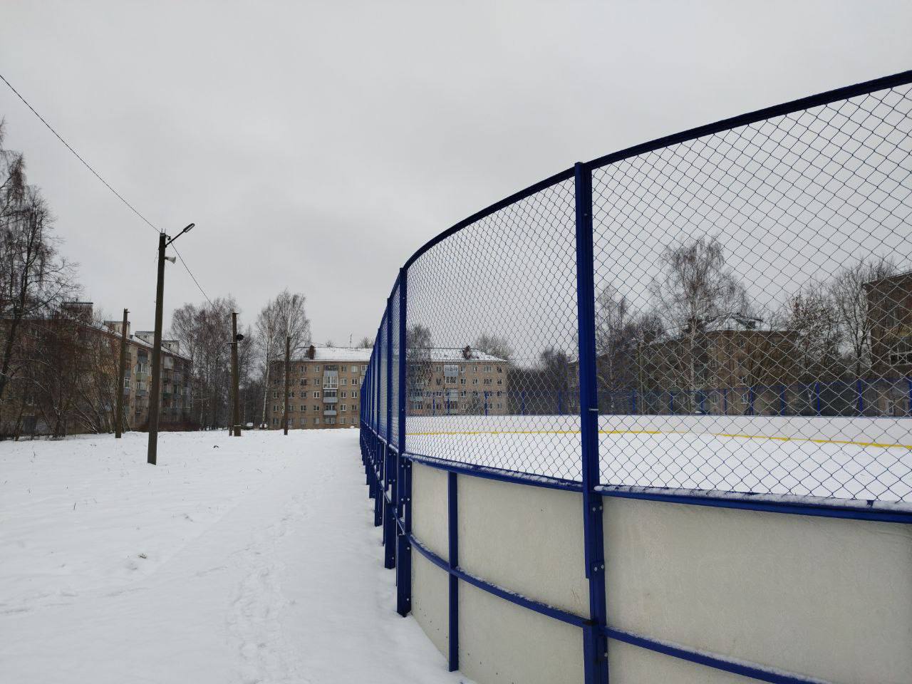 Прошлый корт был признан аварийным и небезопасным для детей. Сейчас ограждение ледовой площадки полностью заменили.