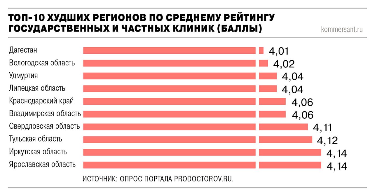 Средняя оценка госклиник за год составила 3,8 из 5 баллов (где 1 — «ужасно», 5 — «отлично»). Частные медучреждения получили более высокий рейтинг — 4,78. Общая оценка удовлетворенности российских пациентов медучреждениями в стране — 4,3.