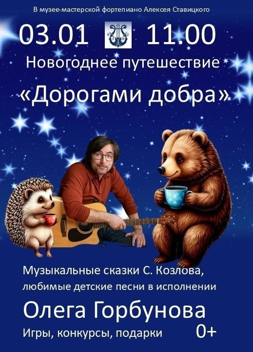 3 января, 11:00 - детский сказочный концерт музыканта и композитора Олега Горбунова;