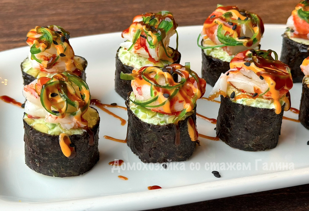 Готовые роллы выложить на сервировочное блюдо и украсить сверху обжаренными креветками. Для придания блюду ярких красок и вкуса можно добавить салат Чука, полить соусом унаги и спайси, а сверху посыпать поджаренными семенами кунжута. Это создаст не только красивую подачу, но и сделает блюдо поистине изысканным.