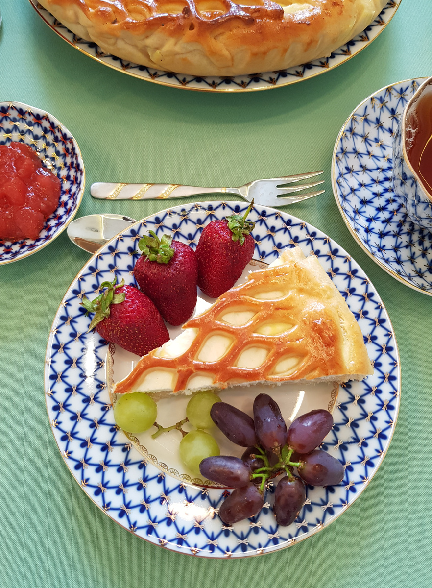 Когда тесто подошло, разделить его на две части: одна должна составлять 2/3 объема, другая — 1/3. Из большей части раскатать круг и положить его в форму, сформировав бортики. На тесто выложить творожную начинку, равномерно распределив ее.
