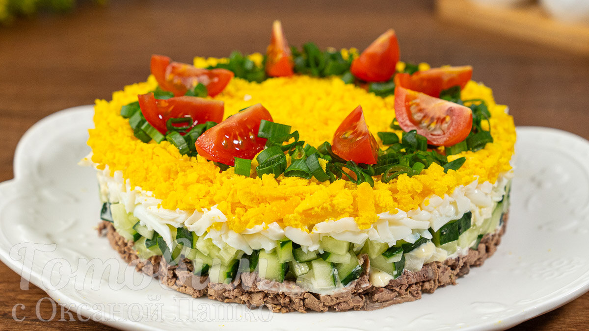 Салат с куриной печенью — это восхитительное и сытное блюдо, которое украсит любой праздничный стол. Сочетание нежной куриной печени с маринованным луком и свежими огурцами создает необычный и свежий вкус. Этот слоеный салат просто готовится и требует только доступных ингредиентов. В качестве альтернативы маринованному луку можно использовать рубленый зеленый лук, что придаст дополнительную свежесть.