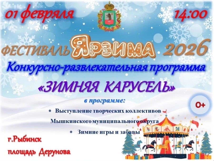 1 февраля концертно- развлекательную программу «Зимняя карусель» подарит рыбинцам Мышкин. Гостей праздника ждут зимние игры и забавы.