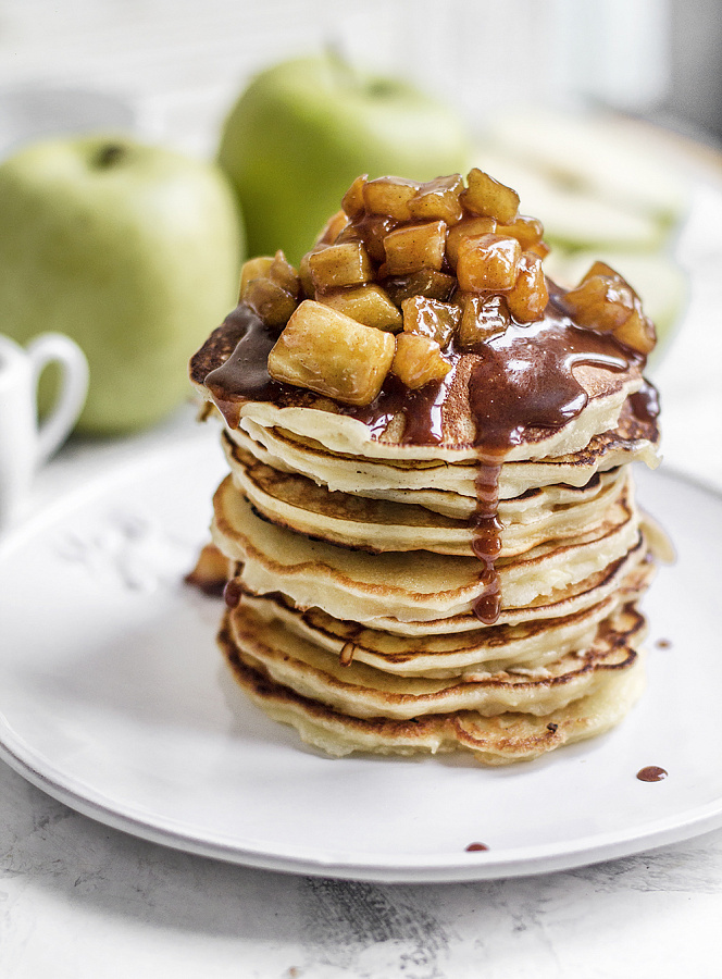 Готовые оладьи поливаются карамелью и подаются теплыми. Такой десерт подходит для семейного завтрака или легкого перекуса между делами.