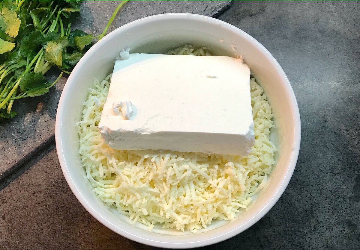 На полке лежит лаваш, рядом сыры и зелень. Адыгейский сыр натирают, к нему добавляют размятый Фета, чтобы масса стала чуть влажной и тянущей. Кинза промыта и мелко нарезана, а орехи — измельчены до желаемой текстуры. Чеснок отправляется в смесь, и всё это соединяется в непритязательную, но запоминающуюся начинку.