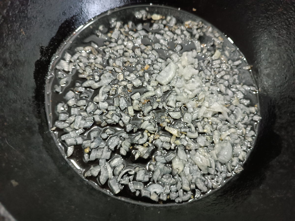 В рагу идут морковь и помидоры или паста: нарезаем кубиками, добавляем к мясу и тушим вместе ещё несколько минут, затем заходим чеснок и специи — хмели-сунели и кавказская соль. Все ингредиенты прогреваются вместе, чтобы ароматы переплелись.